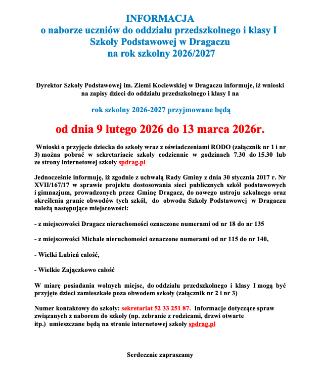 Rekrutacja Zarządzenie Wójta Gminy Dragacz Harmonogram rekrutacji Wniosek o przyjęciu dziecka Wniosek o przyjęciu dziecka zamieszkałego poza obwodem Rodo - zgoda na przetwarzanie danych osobowych