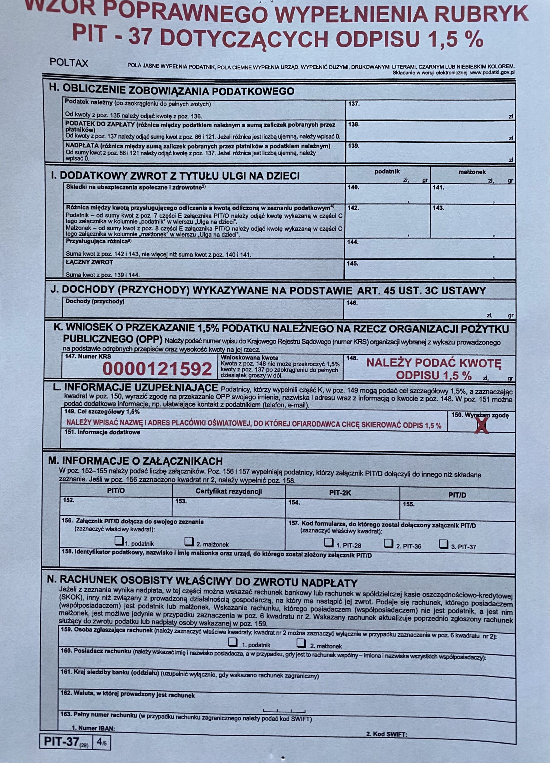 Odnaleźć rubrykę zatytułowaną Wniosek o przekazanie 1, 5 % podatku na rzecz organizacji pożytku publicznego i w rubryce Numer KRS wpisać: 0000121592.