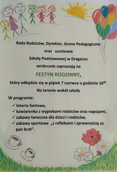 Zapraszamy na Festyn Rodzinny, który odbędzie się w piątek 7 czerwca na teranie naszej szkoły. Zaczynamy o godz. 16:00.